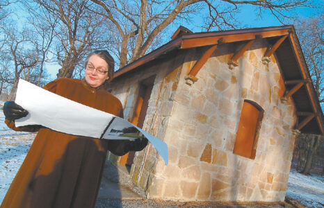-Messenger file photo Jane Gibb, president of the Fort Dodge Parks Foundation, looks over the master plan for Loomis Park next to the old public restroom building which was slated to be restored and used for other purposes.
