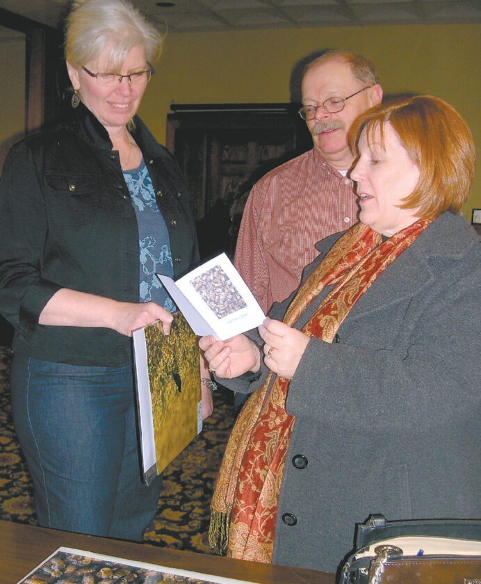Kris Christensen, of Humboldt, right, bought a print because she liked the name, “Have Faith in Others.” Not only did the artist provide a 16- by-20 color print for the art sale to benefit the Beacon of Hope men’s homeless shelter, he added a card inside that added depth to the print. Here Christensen reads the photographer’s card to her husband, Craig, and to the Rev. Barbara Huisman, of Fort Dodge.