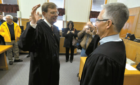 Iowa Supreme Court Chief Justice Mark Cady, right, recreates the swearing in of Iowa District Court Judge Kurt Stoebe, center, to allow family and friends to take pictures after a ceremony in the Humboldt County Courthouse in Dakota City.
