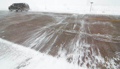 Fingers of blowing snow reach across the surface of Iowa Highway 7 as a storm with high winds and dangerous wind chills moves through the area.