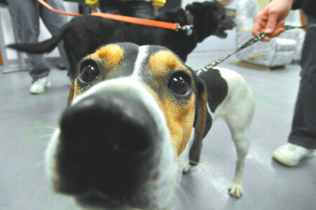 Tessa, who was recently adopted from the Almost Home Shelter of the Humane Society of North Central Iowa by Mitch Ewing, of Fort Dodge, comes back for a visit along with her new family, which includes Andy, the Lab mix standing behind her, and Bruce, another mixed- breed canine. Tessa had been at the shelter since November of 2008.