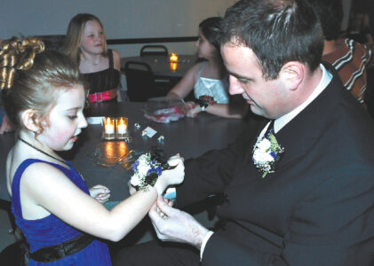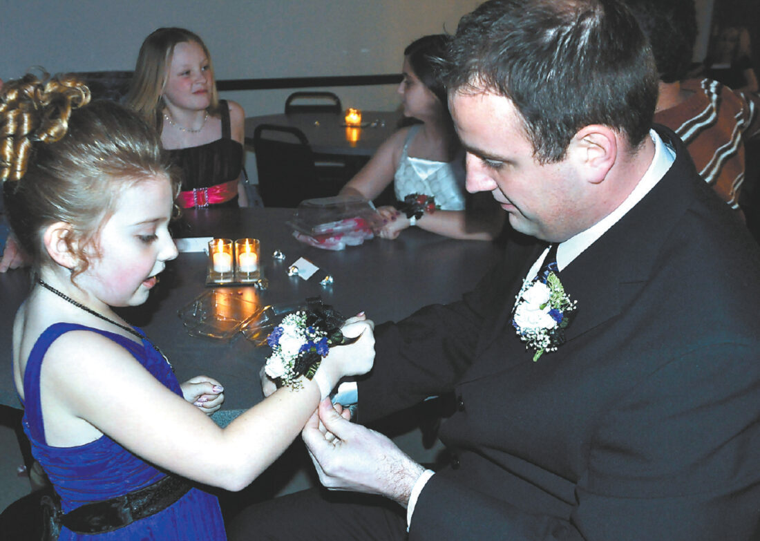 Jacob Peed, of Otho, right, puts a corsage on his then-6-year-old daughter Jordan’s wrist during the Fort Dodge Parks & Recreation Department’s Daddy/Daughter Dance at Citizens Central. Fifty-eight father/daughter and grandfather/granddaughter couples attended the second annual event, which featured dancing, snacks and a professional photo together.