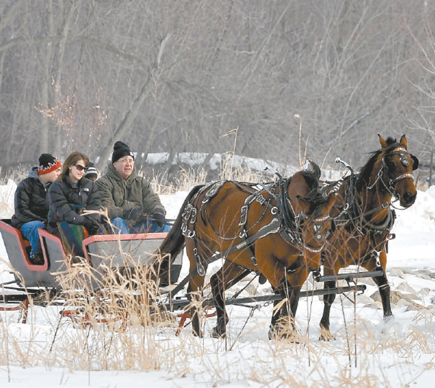 Kevin Harms, of Ackley, drives Bobby, left, and Cocao, right, along the sleigh trail at the 20th annual Wright County WinterFest. The horse- and mule-drawn sleigh rides are a popular attraction at the event.