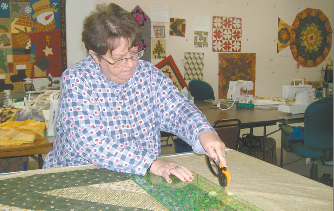 Judy Guderian cuts fabric to be used as a backing for a table cloth. She worked quilting classes at The Family Quilt Shop into her busy schedule and had a bunch of projects started.