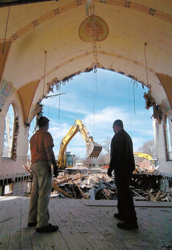 Midwest Construction Services equipment operator Tim Gailey, left, and Mike Konvalinka look over the morning’s demolition work shortly before lunch at the former St. Joseph Catholic Church in Duncombe. The hole in the floor was actually created as part of the lumber salvage operation conducted by Iowa Central Community College when they removed several substantial wood beams.