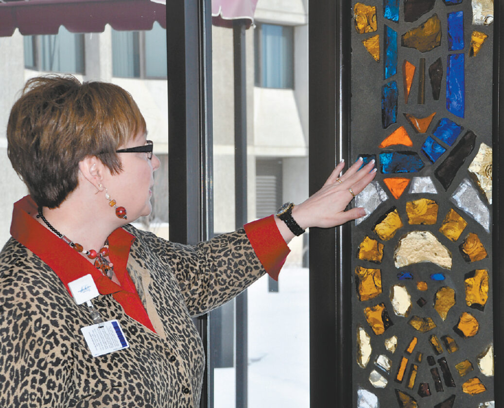Kathy Moe, Trinity Regional Medical Center director of volunteer services, points out details on one of the stained-glass windows at the center of a mystery at TRMC. No one seems to know who designed the windows, which now hang in a TRMC hallway but until recently had been left in a chapel-turned-storeroom.