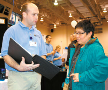 Emer Fortune, of Fort Dodge, talks with Blair Thompson, a CNA at Bethany Life Communities, about possible job opportunities at the 2011 Mid-Iowa Career Fair at Iowa Central Community College’s Hodges Fieldhouse.