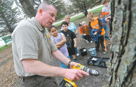 Under the careful scrutiny of Malachia Newman, then 9, left, and Gunner Chada, then 7, Webster County Conservation Director Matt Cosgrove taps a maple tree for its sap, which would then be boiled to make syrup during the annual Maple Syrup Festival in John F. Kennedy Memorial Park.