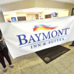 - -Messenger photo by Hans Madsen Paresh Bhatt, at right, who owns what will soon be named the Baymont Inn & Suites, and Whitney Faulkner, hotel manager, hold up a banner that will be used to help rebrand the property as the Baymont Inn & Suites. The hotel is at 2938 Fifth Ave. S. on the city’s Corridor of Commerce.
