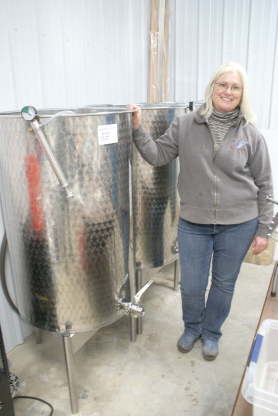 -Messenger photos by Dawn Bliss Mary Haverkamp poses in the winery of her Kossuth County farm, where vinifies 13 different types of wine using grapes from her vineyard and from neighboring grape growers.