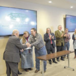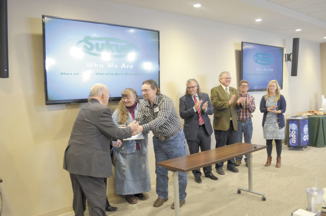 -Messenger photo by Kriss Nelson MIssy and Shawn Kelly, representing First Lutheran Church of Gilmore City, present a grain bin candle holder that features a cross and a certificate of appreciation and thank you to the Sukup family. The grain bin candle holder represents a Safe T Home that is manufactured by Sukup Manufacturing. GoServ and Sukup have partnered together to help serve countries such as Haiti providing structures that serve as homes and other uses. From left are Eugene Sukup, Mary Sukup, the Kelleys, Steve Sukup, Charles Sukup, Brett Nelson and Emily Schmitt.