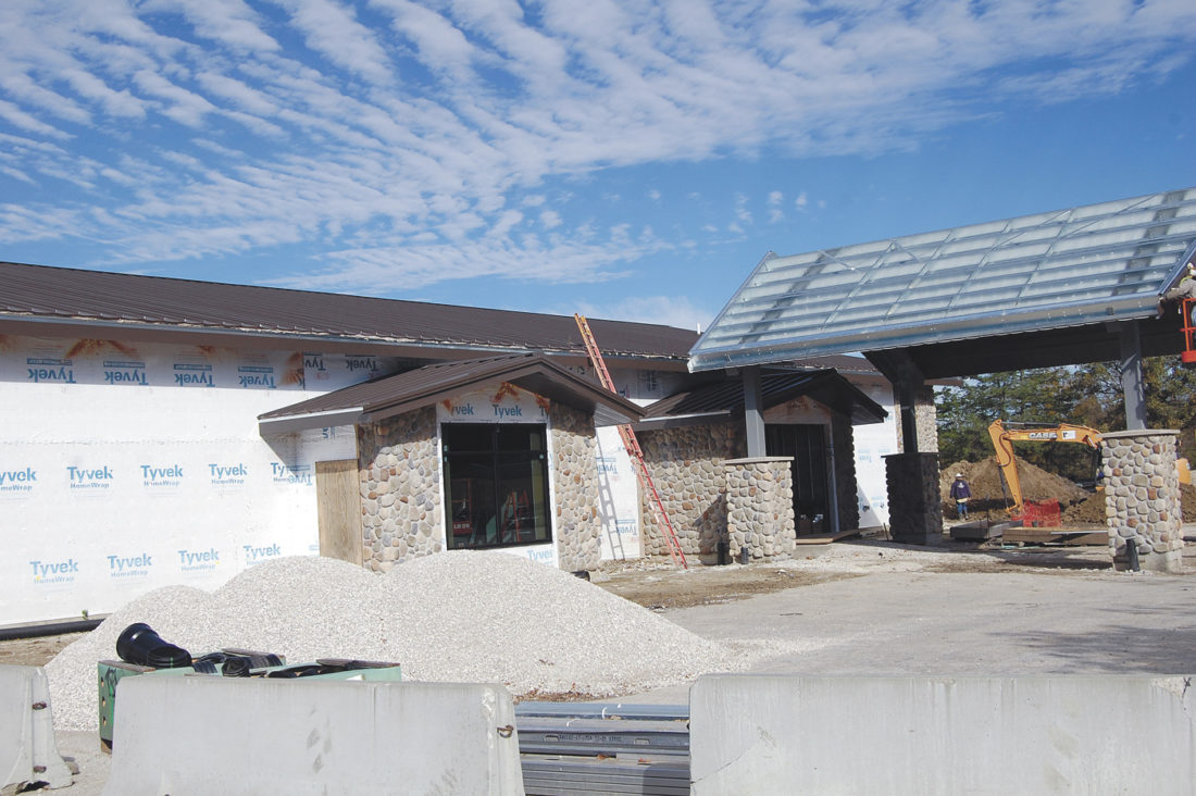The exterior walls are up, the roof is on and exterior stone work has been installed. On Thursday, the construction crew was working on the canopy above the drive-through, and inside, drywall was being installed.