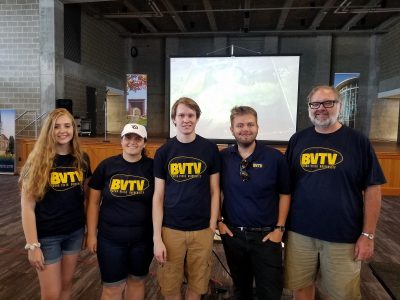 Buena Vista University (BVU) students (left to right) Morgan Krull, Jordyn Daggs-Olson, Mason McGrew and Zach Hess, along with Jerry Johnson, a BVU assistant professor of digital media and avowed Walt Disney fanatic, showed their “Growing Magic” film at the 2019 Iowa State Fair.