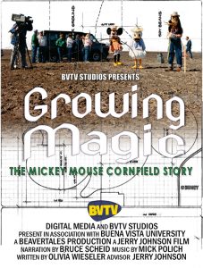 The story of how the Pitzenbergers’ cornfield became a star attraction in the summer of 1988 is portrayed in the 60-minute documentary “Growing Magic: The Mickey Mouse Cornfield Story,” which debuted March 28, 2019. The film was written and produced by Buena Vista University (BVU) digital media students. The project encompassed 3.5 years, thousands of miles in travel and dozens of students who were guided by Jerry Johnson, a BVU assistant professor of digital media and avowed Walt Disney fanatic.