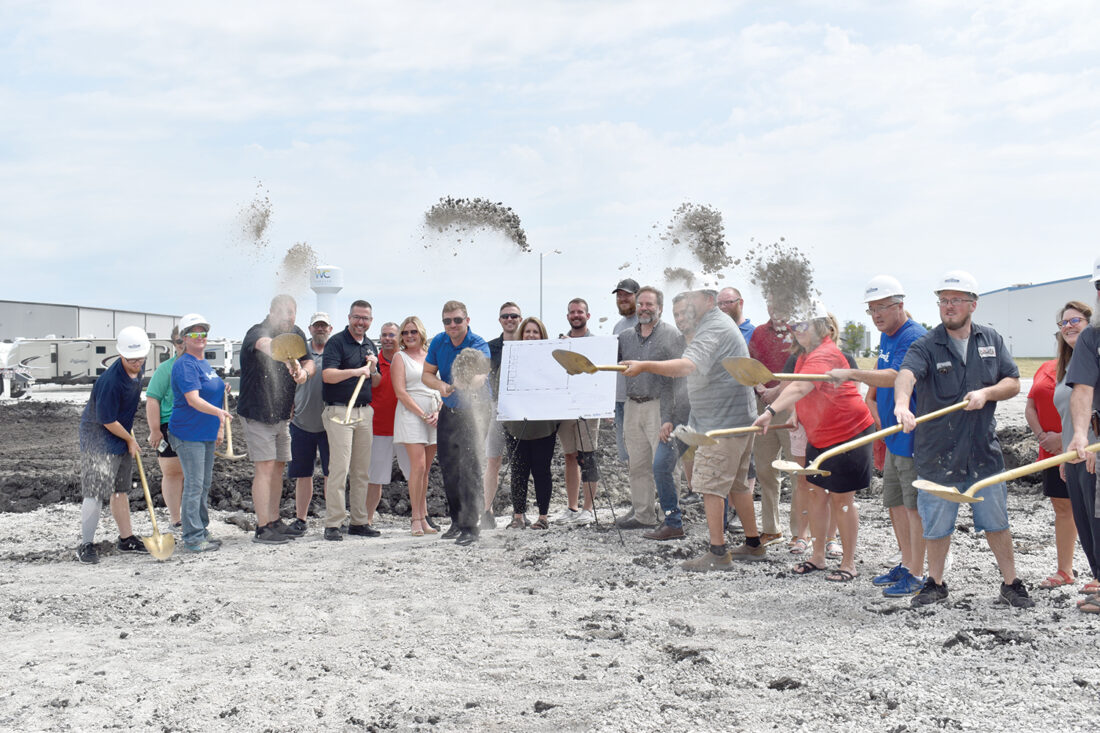 Adam Ruppel, president of Good Life RV, pictured center in the blue shirt, throws a little dirt with the golden shovel during the official groundbreaking for Good Life’s new service department addition in Webster City. He is joined by enthusiastic friends and colleagues.