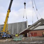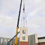 There, they attached the panel to a 150-foot-tall, 165-ton crane from Dave’s Crane and Wrecker Service, of Union. In a few short minutes, the crane tipped the 32-foot panel upright and swiveled it into place next to a number of others forming the side of the gym.