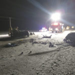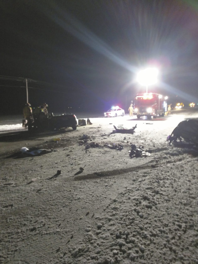 - -Messenger photo by Chad Thompson Two people were injured, one seriously, in a two-vehicle collision on U.S. Highway 169 south of Humboldt Friday night, according to the Humboldt County sheriff’s office. Traffic was backed up for about an hour while Humboldt volunteer firefighters worked to rescue one of the crash victims who was pinned inside his vehicle.The names of the crash victims were not available Friday night. The Humboldt Police Department was also on scene.