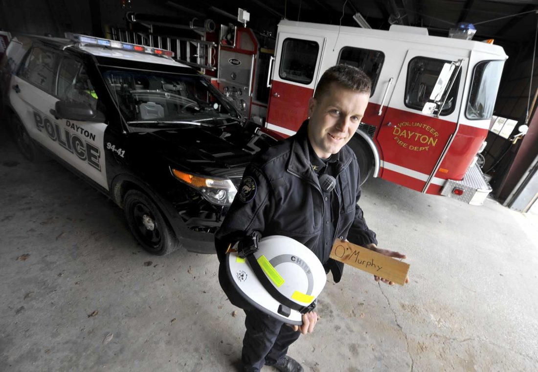 DAYTON — On occasion, Nick Dunbar, the Dayton fire chief and Dayton police chief, literally gets to wear the fire helmet from one job with the police uniform from the other.
