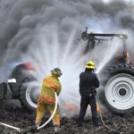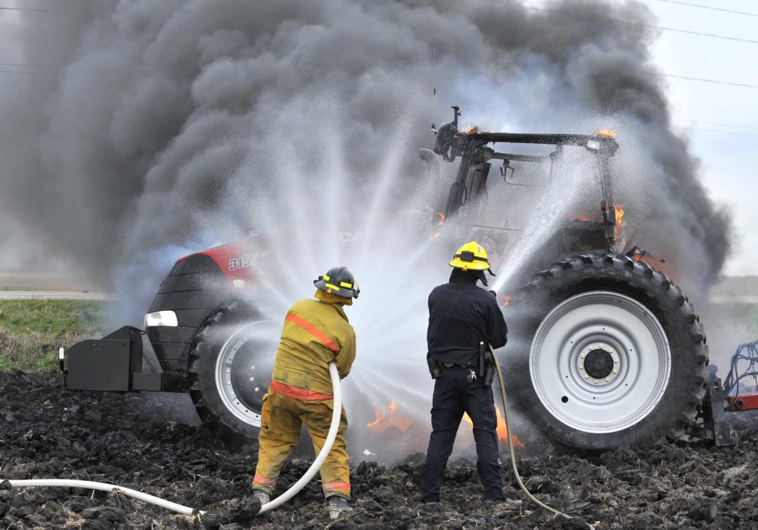 -Messenger photo by Hans Madsen Then-Dayton Assistant Fire Chief Nick Dunbar, right, along with a Lehigh firefighter, spray water on a burning tractor during a fire call on Racine Avenue north of 240th Street in October 2016. Dunbar was on duty as the Dayton Police Chief when the call came in. He’s since been voted Chief by his fellow firefighters.