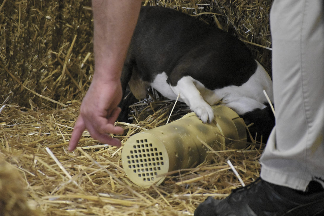 At the novice level, the dog must climb a hay bale, go through a tunnel and find one rat.