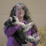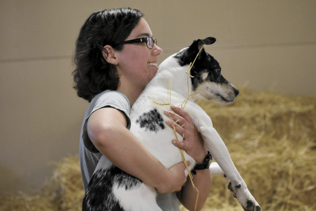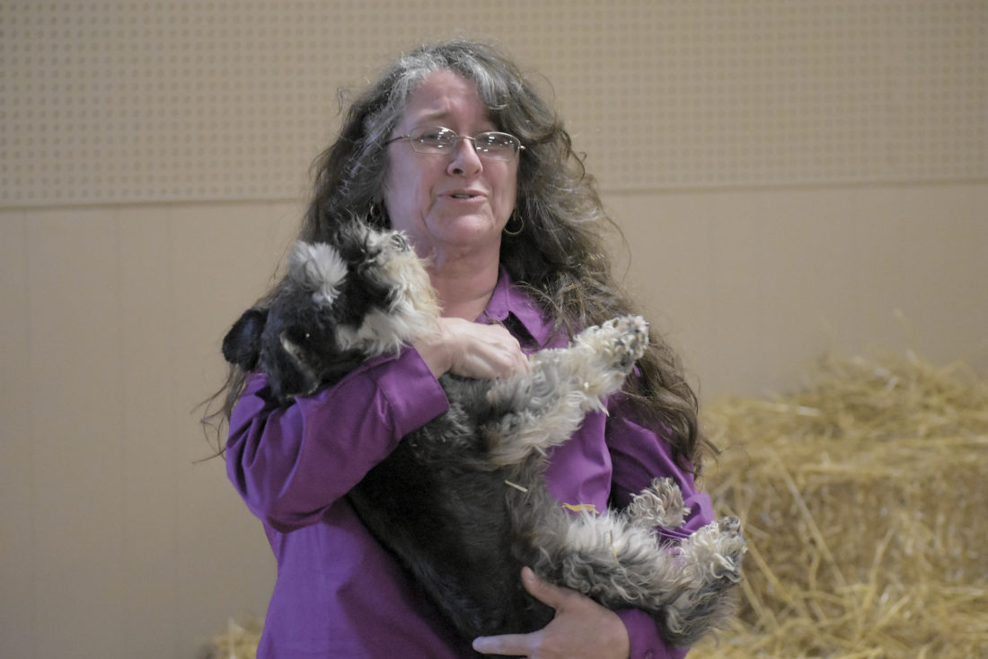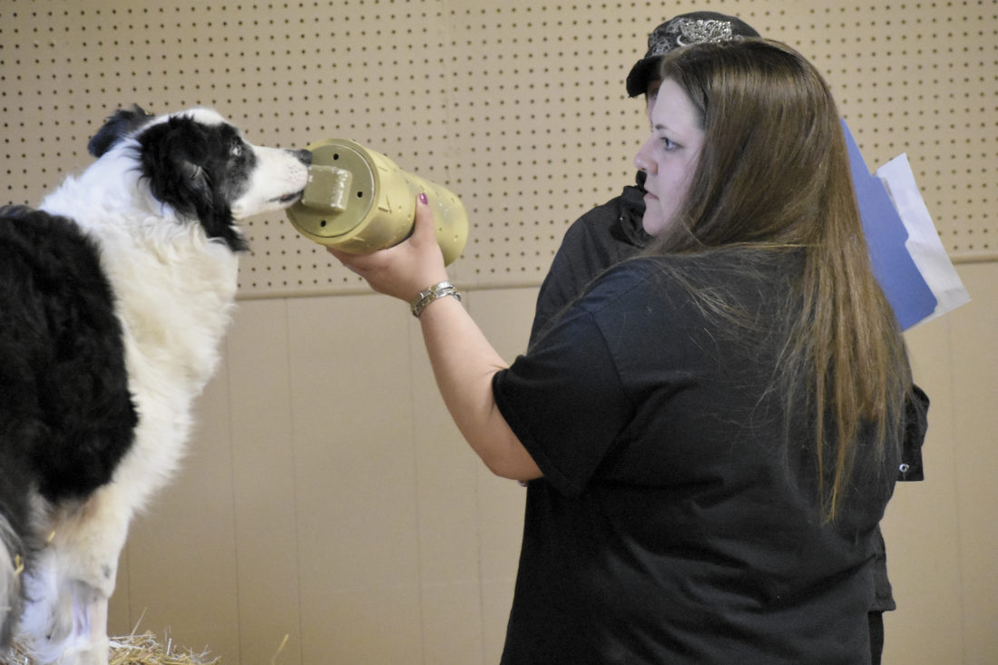 -Messenger photo by Chad Thompson Bonnie Gutzwiler, a judge at the Barn Hunt, shows her dog the rat it missed during a trial Sunday morning at the Webster County Fairgrounds. Barn hunt is a sport for dogs where the dogs search for rats in tubes within a course made of hay.
