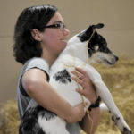 -Messenger photo by Chad Thompson Liz Hawkins, an organizer and judge of the Barn Hunt trials in Fort Dodge, cradles her dog, Jager, after competing in the trials herself Sunday morning.