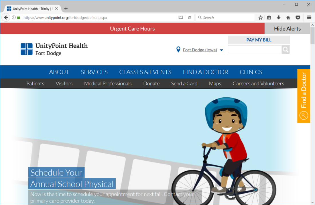 - A screenshot shows the up-to-date website for UnityPoint Health — Trinity Regional Medical Center, found at unitypoint.org/fortdodge. UnityPoint is cautioning users to use this website, and not one which can be found online using its former logo and out-of-date information.