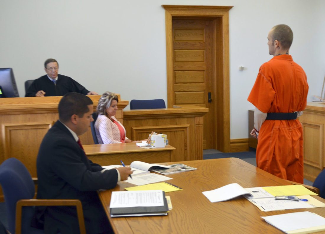 -Messenger photo by Joe Sutter Timothy Wood, right, speaks to Chief Judge Kurt Wilke, of the 2nd Judicial District, during a guilty plea hearing in Webster County District Court Monday. Wood pleaded guilty to second-degree arson. First Assistant Webster County Attorney Ryan Baldridge takes notes at left.