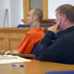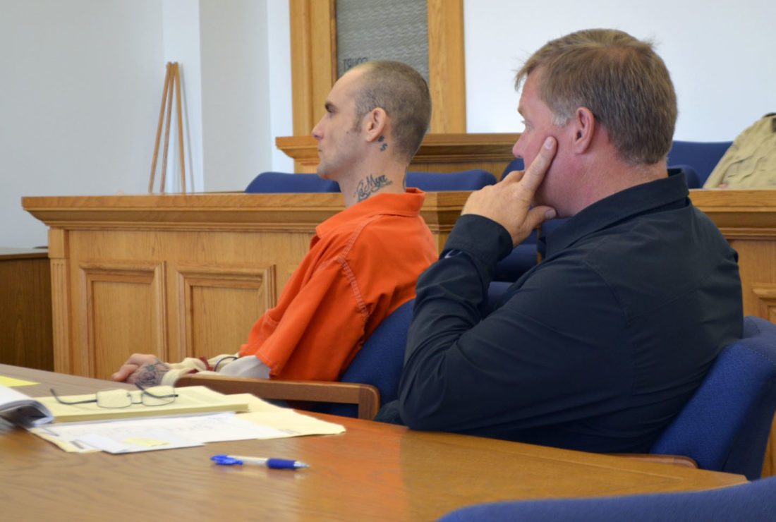 -Messenger photo by Joe Sutter Timothy Wood, left, listens during his guilty plea hearing in Webster County District Court as his attorney, Jason Carlstrom, of Des Moines, listens at right. Wood pleaded guilty to arson in connection with burning down a root beer tent earlier this year.