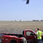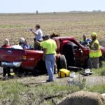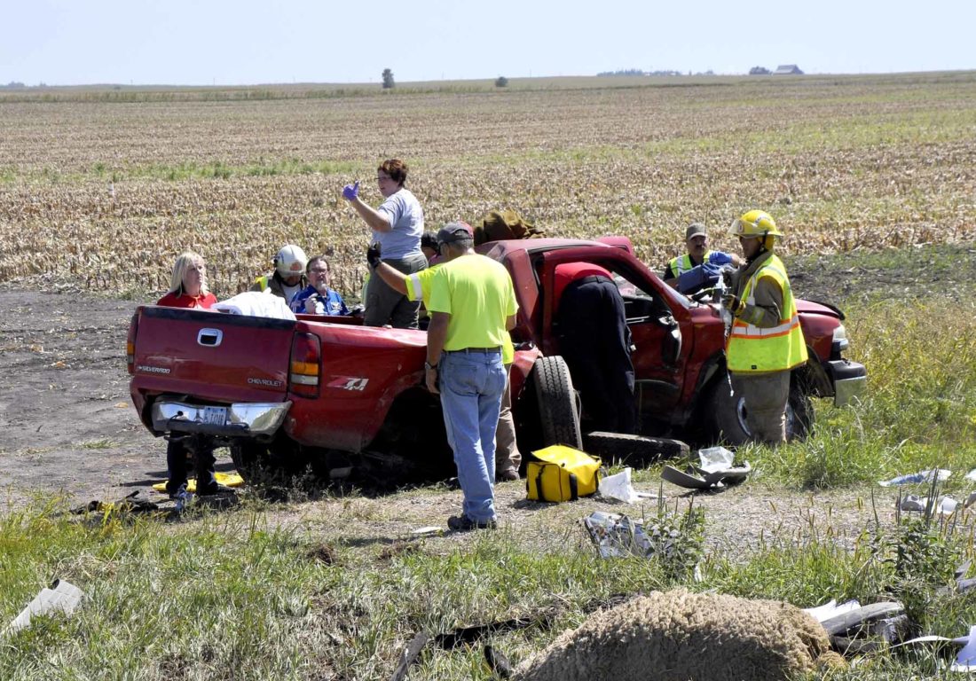 -Messenger photo by Joe Sutter Rescue crews attend to the driver of this pickup truck, who was then carried across the field to the waiting helicopter and airlifted to Des Moines. Calhoun County EMS, Gowrie Southwest Webster Ambulance Service and Farnhamville EMS all responded.