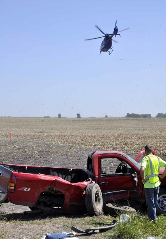 - -Messenger photo by Joe Sutter Rescue crews attend to the driver of this pickup truck, who was then carried across the field to the waiting helicopter and airlifted to Des Moines. Calhoun County EMS, Gowrie Southwest Webster Ambulance Service and Farnhamville EMS all responded.