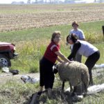 -Messenger photo by Joe Sutter One sheep appeared to be dead after the accident southwest of Gowrie. This one was laying on its side breathing heavily, but this one got up after people went to it—perhaps just stunned. Five other sheep escaped into the fields. Five people were taken to the hospital with injuries.