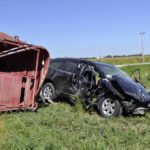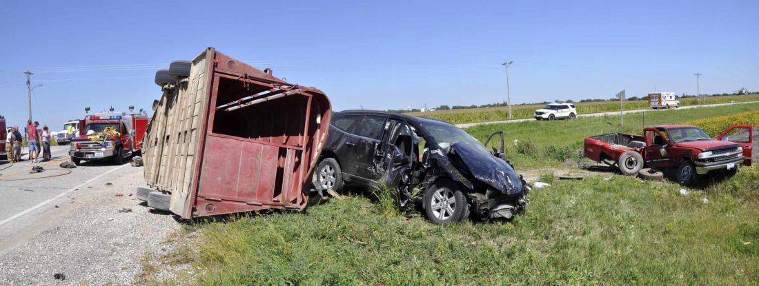 -Messenger photo by Joe Sutter Four people from this Chevrolet Traverse were taken to the hospital in Fort Dodge, while the driver of the pickup was airlifted to Des Moines, after a crash at the intersection of Iowa Highway 175 and County Road P33 outside Gowrie Friday afternoon. One sheep from the trailer appeared to be dead, while another was just stunned and five more escaped.