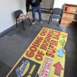 -Messenger photo by Hans Madsen Prairie Valley School Board President Shannon Miller looks over a blanket left behind in the Macke Motors building in Gowrie. The Southeast Valley district has nearly completed the process to purchase the former Chevrolet dealership’s building.