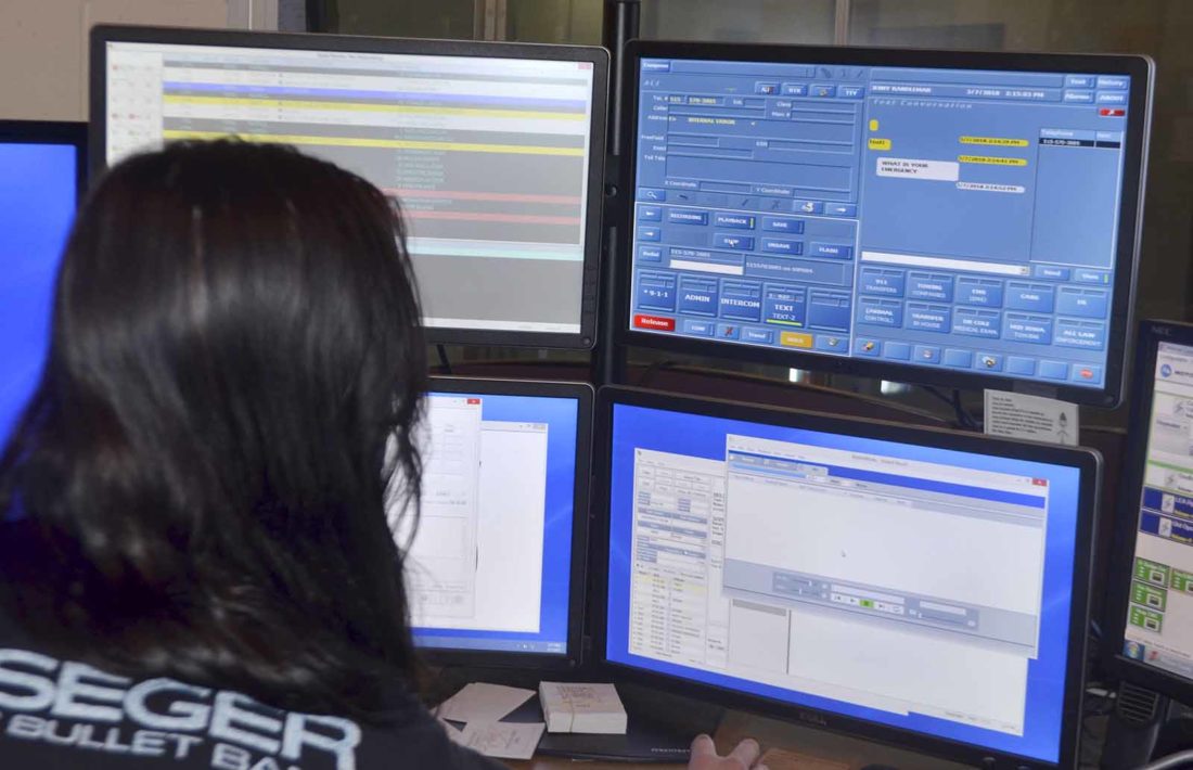 Jenny Randleman, a dispatcher with the Webster County Communications Center, demonstrates how she would respond to a person who texted in a 911 call. The conversation is in the upper right hand monitor.