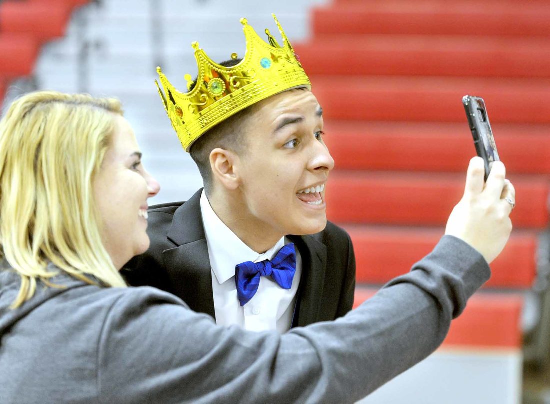 Freshly crowned royal Roberto Espinal hams it up for a picture with his teacher, Jessica Froisland following the 2018 Fort Dodge Senior High Prom Coronation Friday.
