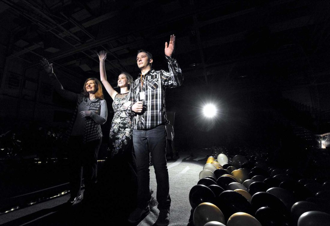 Josie Schild, center, along with her mom, Jennifer Schild and her brother, Justin Schild, wave to the audience Friday afternoon during the Fort Dodge Senior High Prom Coronation.