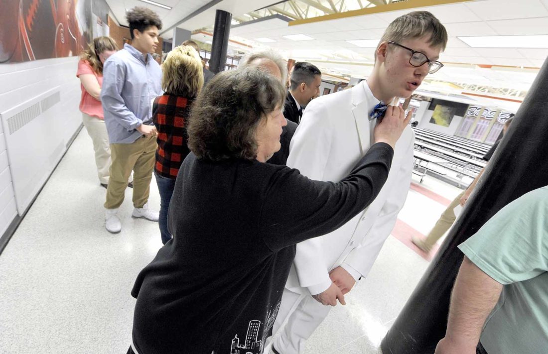 Dawn Bethke, at left, makes sure her son, Dylan Bethke, has his bow tie perfectly level Friday afternoon before the Fort Dodge Senior High Prom Coronation.