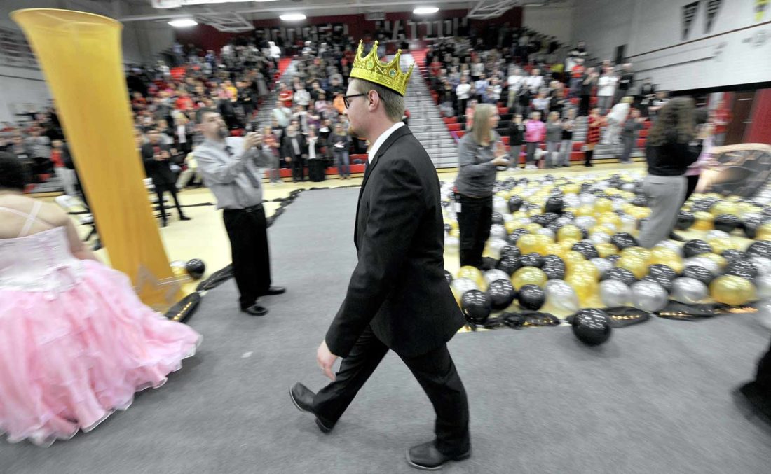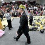 Freshly crowned Prom Royal Tyle Klein makes his way down from the stage Friday afternoon during the 2018 Prom Coronation at Fort Dodge Senior High.