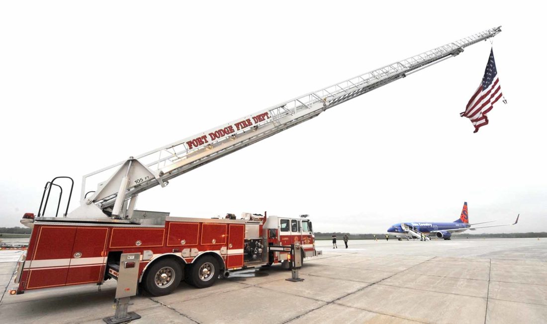 - -Messenger photo by Hans Madsen Fort Dodge Fire Department’s Ladder 1 displays a large U.S. flag Saturday morning as the Brushy Creek Area Honor Flight finishes boarding at the Fort Dodge Regional Airport.