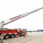 -Messenger photo by Hans Madsen Fort Dodge Fire Department’s Ladder 1 displays a large U.S. flag Saturday morning as the Brushy Creek Area Honor Flight finishes boarding at the Fort Dodge Regional Airport.
