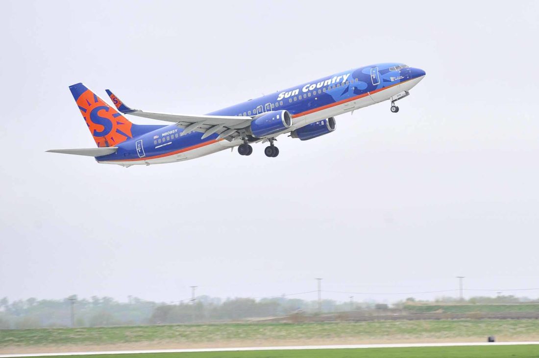 -Messenger photo by Hans Madsen The Sun Country Boeing 737-800 carrying the veterans and support staff of the 16th Brushy Creek Area Honor Flight takes off Saturday morning from the Fort Dodge Regional Airport for a day in Washington D.C.