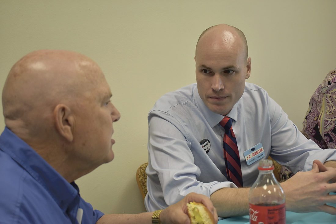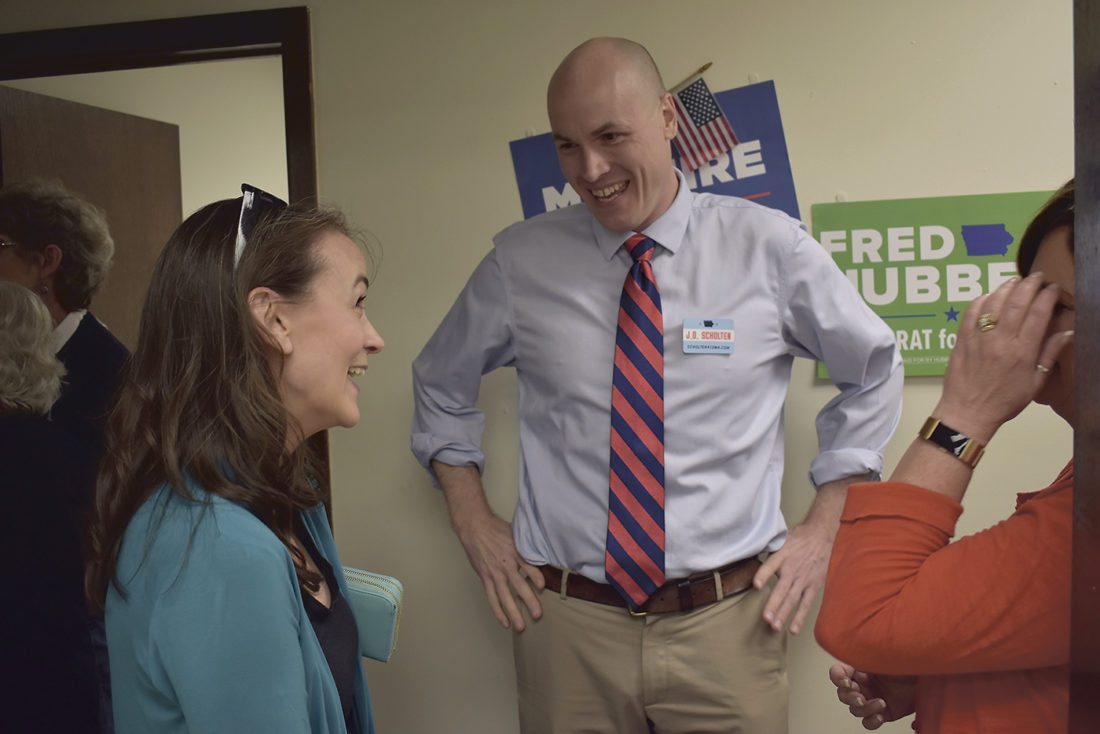 JD Scholten, D-Sioux City, right, visits with Daryl Beall, of Fort Dodge, during a potluck at the Webster County Democrat headquarters, 1605 First Ave. N, Wednesday evening. Scholten is a candidate for the Democratic nomination for the U.S. House of Representatives in the congressional district that includes Webster County.