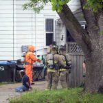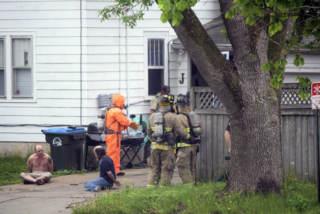 An official in protective gear prepares to go through the garbage can outside 506 N. 17th St., where police say two people were making meth. Nearby Webster County Sheriff’s Sgt. Luke Fleener and Fort Dodge Police Officer Nathan Wolfe interview a man who was not arrested Monday.