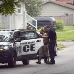 Daniel Jones, left, and another man wait in handcuffs as officers and Fort Dodge Firefighters investigate a house where they say meth was being manufactured, at the corner of 17th Street and Sixth Avenue South, just across the street from Duncombe Elementary.