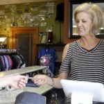 Jill Bush, co-owner of Rush Hour Clothing Co., helps a customer pay for clothes at the store. This Friday and Saturday is the tax-free holiday across Iowa, which means clothing and shoe purchases will be tax-exempt for the weekend.