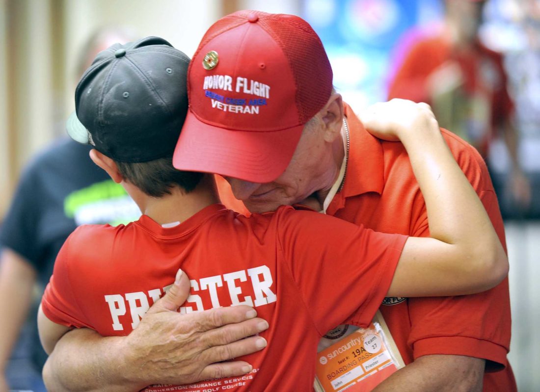 John Priester, of Swea City, gets a hug from his grandson, Talan Priester, as he prepares to board the Brushy Creek Area Honor Flight for Washington, D.C. Saturday morning at the Fort Dodge Regional Airport.