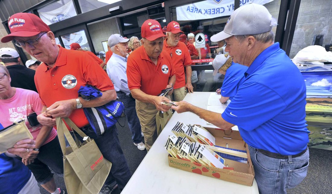 Volunteer Jim Flaherty, of Fort Dodge, right, helps veteran Ray Kraus, of Carroll, get the right boarding pass Saturday morning as the veterans prepare to board the Brushy Creek Area Honor Flight. The organization, including its board, is staffed entirely by volunteers.