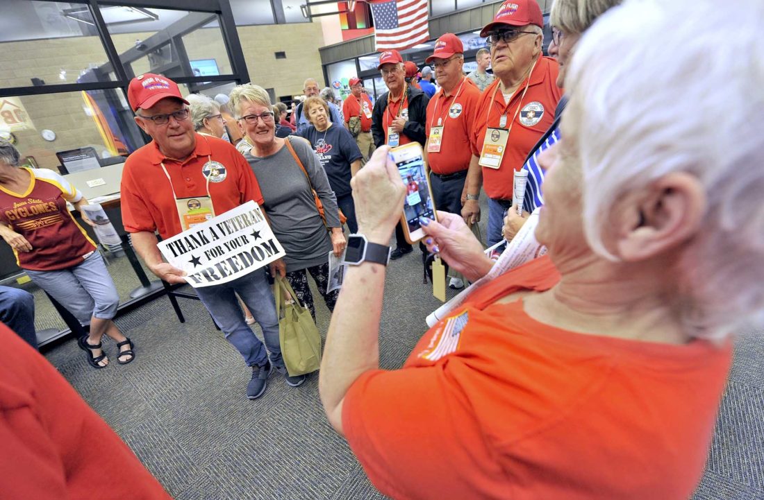 While Fletcher helped the veterans get their dog tags on, her fellow Daybreak Rotary Club member Jim Flaherty, of Fort Dodge, was helping make sure that the right boarding pass went with the right veteran.