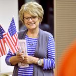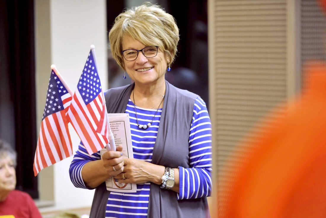 Diane Schutt, of Clarion, is all smiles Saturday morning as she helps send off the veterans taking the Brushy Creek Area Honor Flight to Washington, D.C., at the Fort Dodge Regional Airport. Schutt was there for her friends Larry and Raynee Delano.